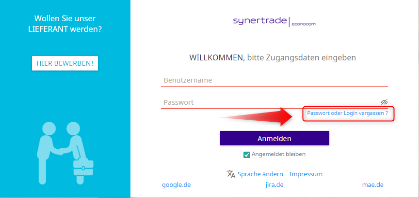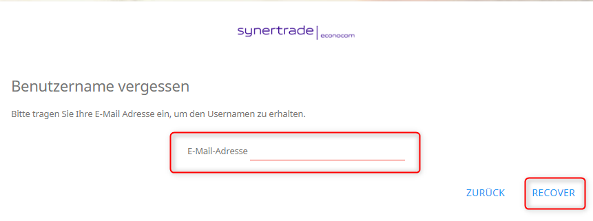 Um Ihr Login abzurufen, klicken Sie auf „Passwort oder Login vergessen?“ und dann auf „Benutzername vergessen?“. Geben Sie die E-Mail-Adresse ein, mit der Sie sich registriert haben, und klicken Sie abschließend auf „Recover“.