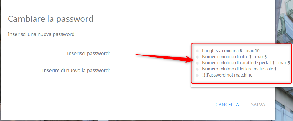Se la nuova password rispetta tutte le regole indicare verrà attivato il tasto Salva.