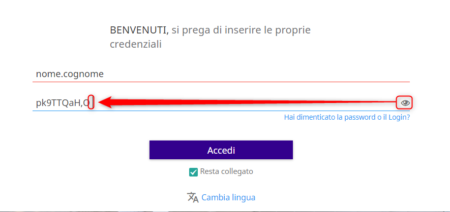 Utilizzare l'icona on l'occhio per visualizzare la password, fare un click dopo l'ultimo carattere e assicurarsi che non ci siano spazi prima o dopo la password temporanea.