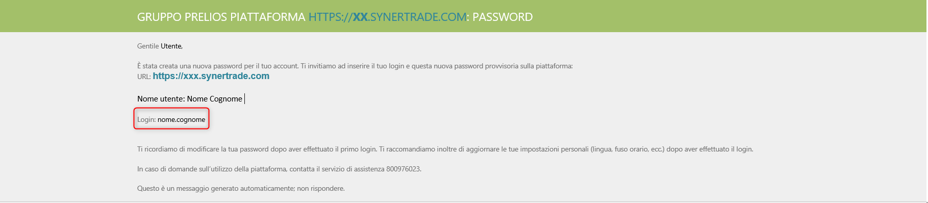Le credenziali di accesso possono essere verificate nell'email ricevuta, come nell'esempio che segue.