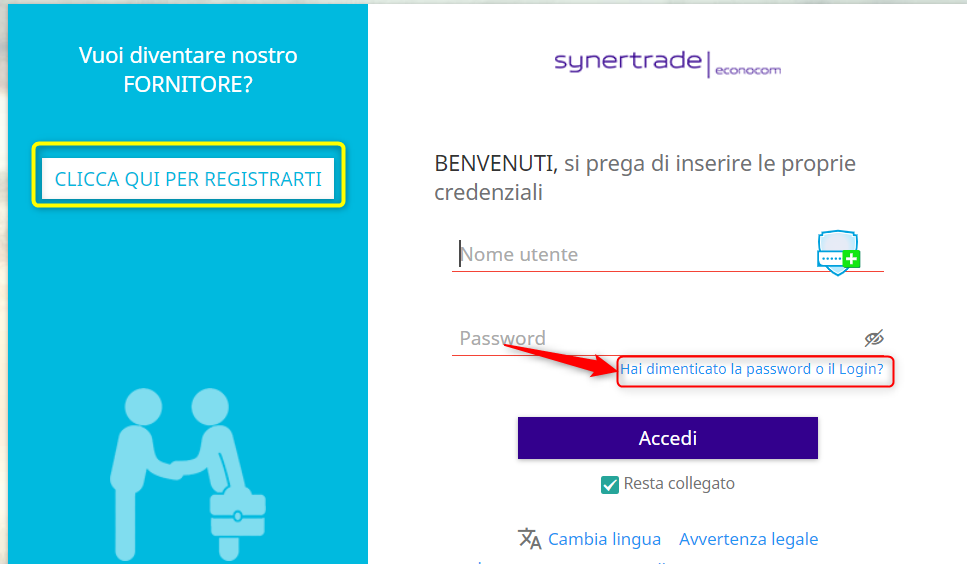 Se siete già registrati come fornitori nel sistema (registrazione spontanea o su invito) dovete solamente inserire login e password nella finestra di accesso che si trova nella parte destra della pagina.