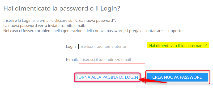 Per recuperare la password inserite il login e l'indirizzo email con cui siete registrati